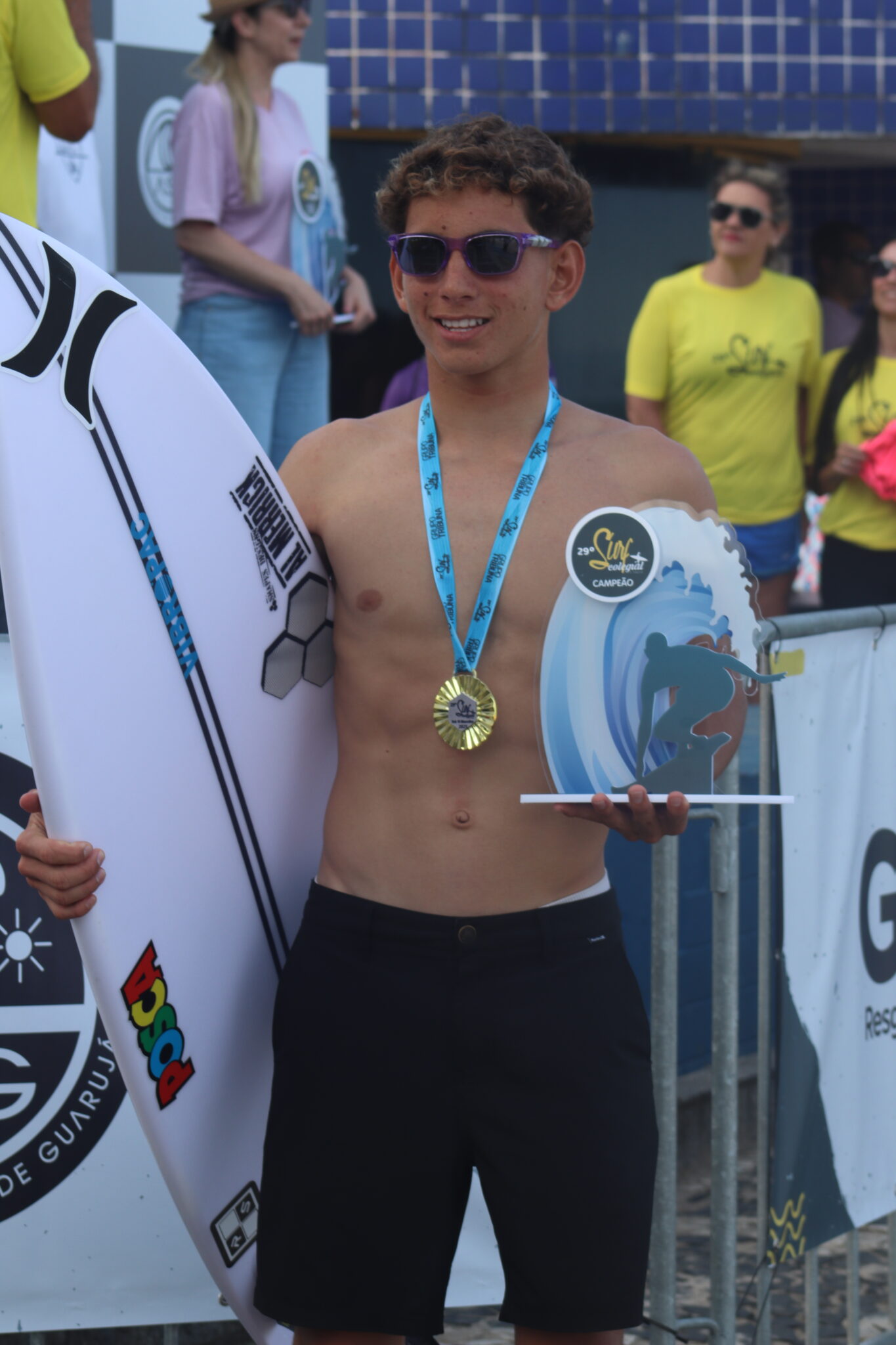 O surfista Bryan Almeida, representante do Colégio Alfa, de Guarujá, brilhou na Tribuna de Surf Colegial e conquistou o título da categoria Sub-16. Com um surf consistente, manobras potentes e excelente leitura das ondas, Bryan dominou as baterias desde as classificatórias até a grande final, garantindo o primeiro lugar e levando o nome do Guarujá ao topo do pódio.